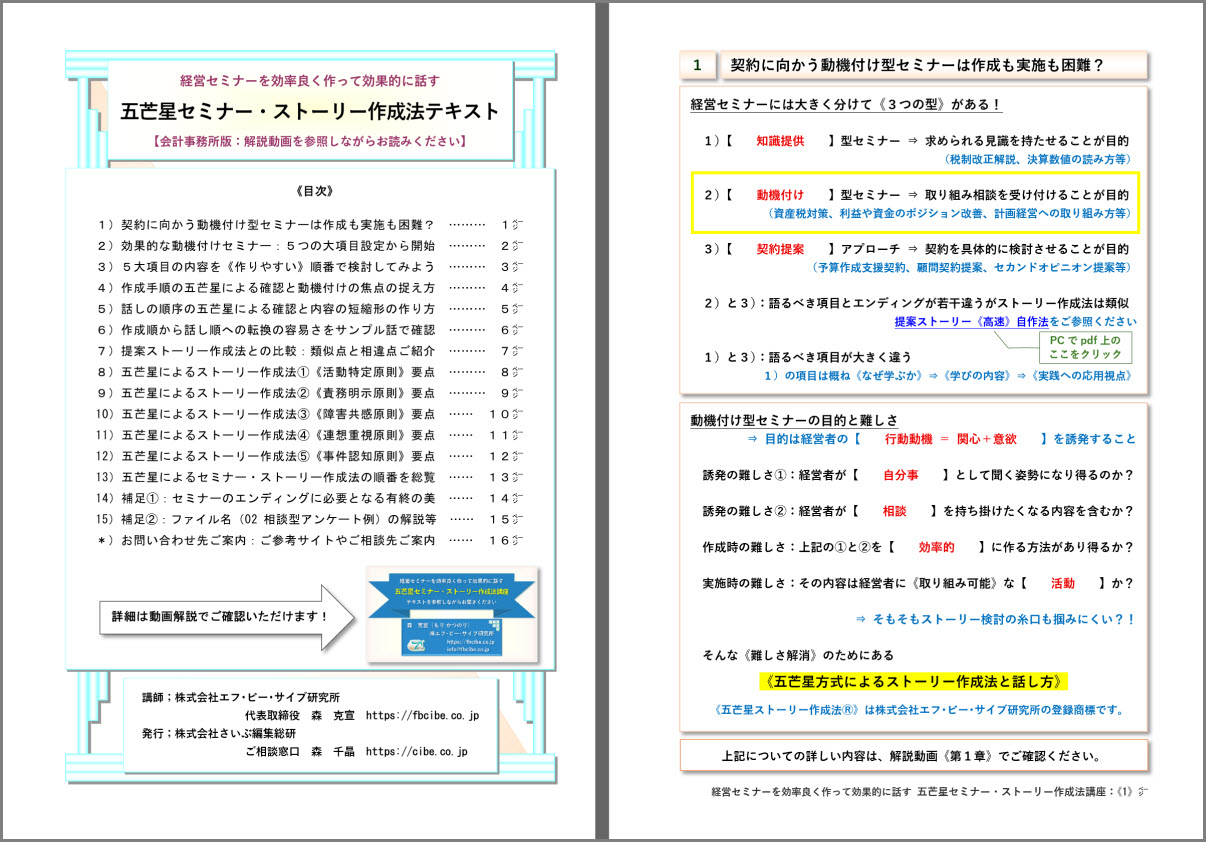 もちろん、本講座の目的は《作りやすく話しやすい》独自のセミナーストーリーを作成することですが、たとえば短時間の面談やちょっとした対話の中でも、《手短に動機付ける》方法への応用や、事務所で開催する《小規模勉強会》向けの活用視点をも、ご紹介しています。