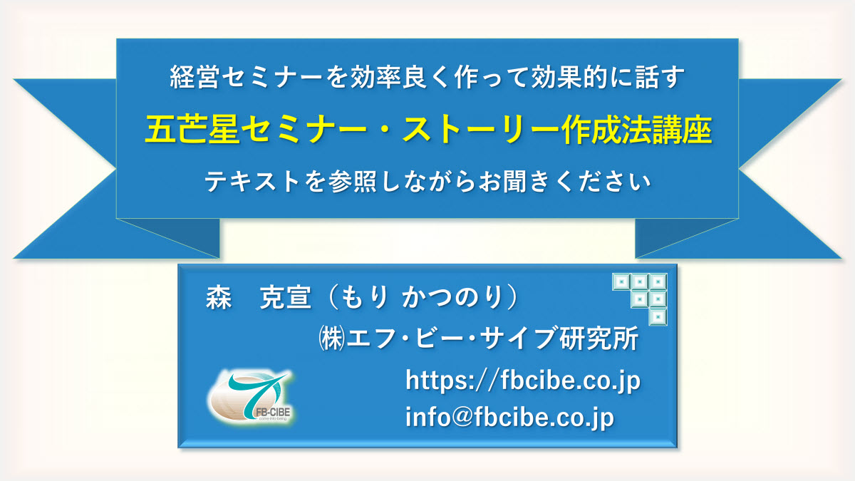 もちろん、本講座の目的は《作りやすく話しやすい》独自のセミナーストーリーを作成することですが、たとえば短時間の面談やちょっとした対話の中でも、《手短に動機付ける》方法への応用や、事務所で開催する《小規模勉強会》向けの活用視点をも、ご紹介しています。